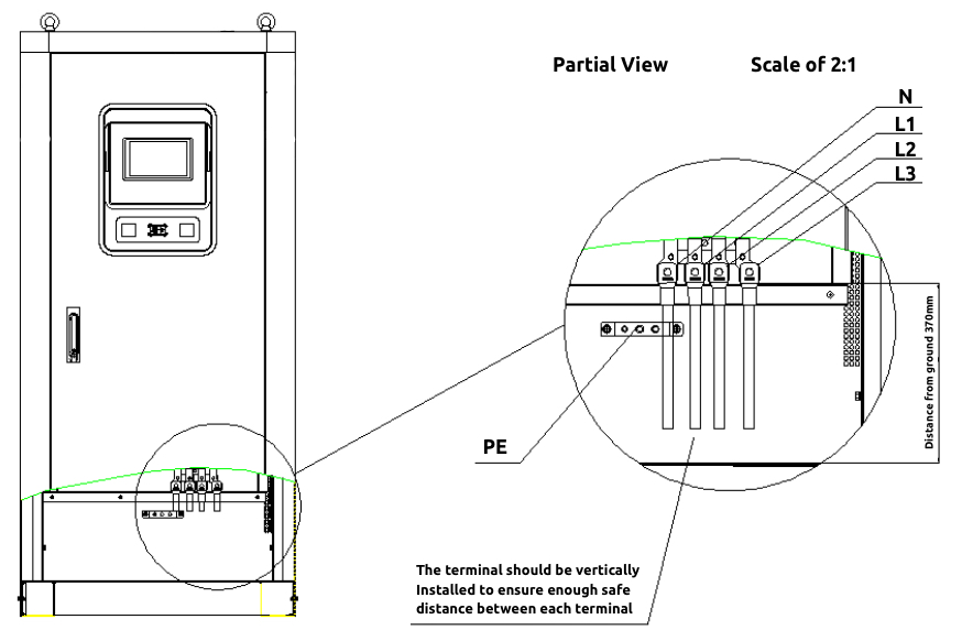 The DC charging cable/s and AC input cable must be affixed with appropriate cable ends with a M8 hole to be attached to the bus-bars.